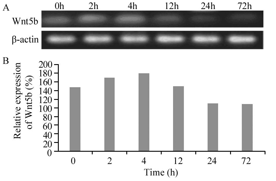 | 图 2 阿霉素作用下MHCC97-L中Wnt5b的表达 Figure 2 Expression levels of Wnt5b in MHCC97-L cell line treated with ADM detected by Western blot |