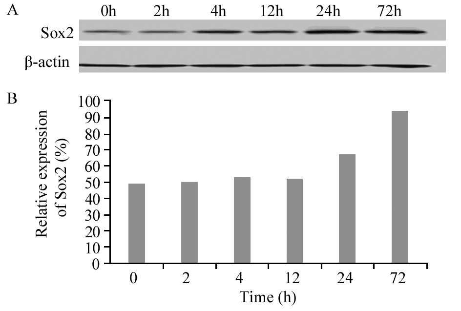 | 图 6 阿霉素影响下HCC LM3中Sox2的表达 Figure 6 Expression levels of Sox2 in HCCLM3 cell line treated with ADM detected by Western blot |
