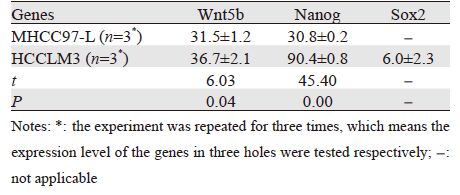阿霉素(ADM)作为一种广谱抗肿瘤药物,通过干扰转录过程诱导肿瘤细胞凋亡[12, 13],然而目前包括ADM在内的传统化疗药物大多是对处于增殖期的细胞产生杀灭作用,虽然可以使肿瘤体积缩小甚至完全缓解,但却不能根除肿瘤干细胞(cancer stem cells,CSCs)。相反当癌细胞受到ADM刺激后,会引起一系列应激性保护反应,从而使细胞产生耐药性[14]。本研究首次较全面地分析了在ADM的作用下,肝癌相关基因Nanog、Oct4、Sox2、ARID1A和Wnt5b在两株转移能力不同的肝癌细胞系中表达水平的不同,有利于系统性地了解肝癌复发转移的分子机制,为肝癌干细胞靶向干预治疗寻求准确的标志物和靶点。