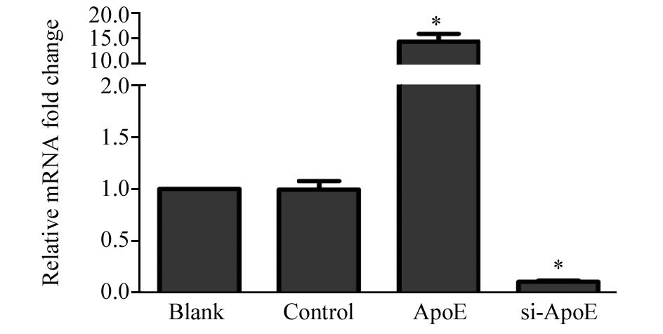 1.3 实验分组实验分为四组,空白对照组(Blank)、阴性对照组(Control)、ApoE沉默组(si-ApoE)、过表达ApoE组(ApoE)。