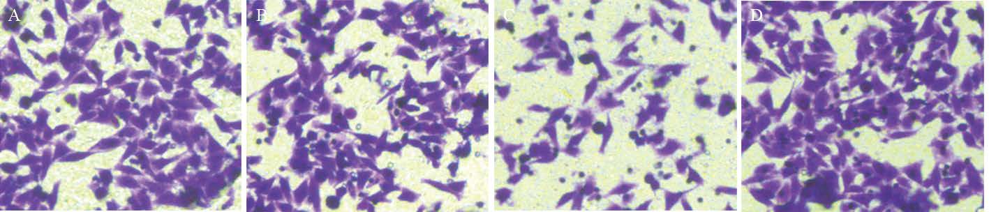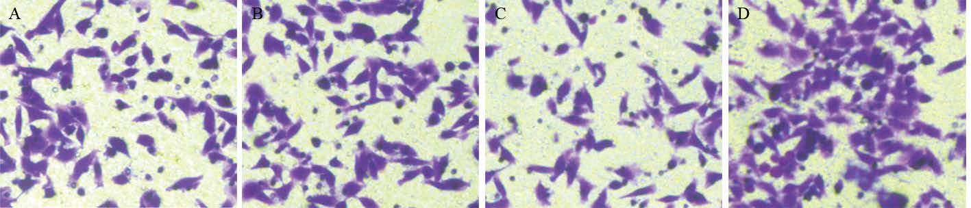1.5 Transwell侵袭实验收集转染后的各组细胞,重悬于无血清RPMI1640培养液,以5×104/孔密度加入到预铺好Matrigel胶的Transwell小室上室内,下室加入500 ml完全培养液,置于37℃、5%CO2的细胞培养箱中培养24 h后多聚甲醛固定,0.01%结晶紫染色,200倍光学显微镜下计数穿膜细胞数,随即取5个视野,取平均值,每组实验设3个复孔,实验重复3次。
