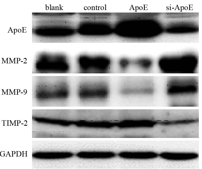 1.7 免疫印迹(Western blot)实验收集上述转染后的各组细胞,裂解获取细胞总蛋白,蛋白样品行聚丙烯酰胺凝胶电泳,PVDF膜转膜并用脱脂奶粉封闭非特异性结合,然后依次孵育一抗及二抗,最后用ECL显色液显影检测细胞中ApoE、MMP-2、MMP-9及TIMP-2的表达,以GAPDH作为内参,实验重复3次。