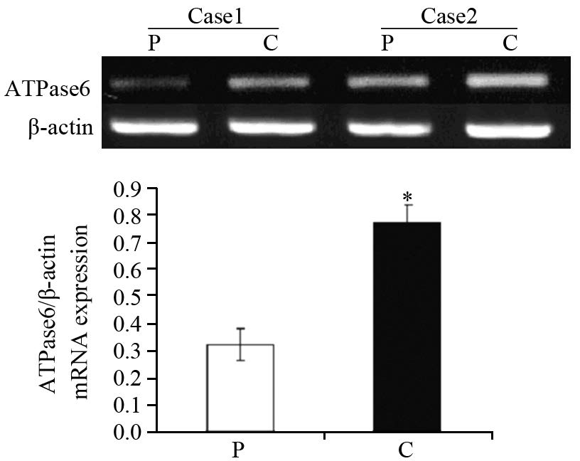 | P: adjacent normal tissues; n=25; C: breast invasive ductal carcinoma tissue; *: P<0.01, compared with P 图 1 乳腺浸润性导管癌组织与癌旁组织mtDNA ATPase6 mRNA的表达 (n=25) Figure 1 Comparison of mitochondrial DNA (mtDNA) ATPase6 mRNA expression between breast invasive ductal carcinoma and adjacent normal tissues (n=25) |