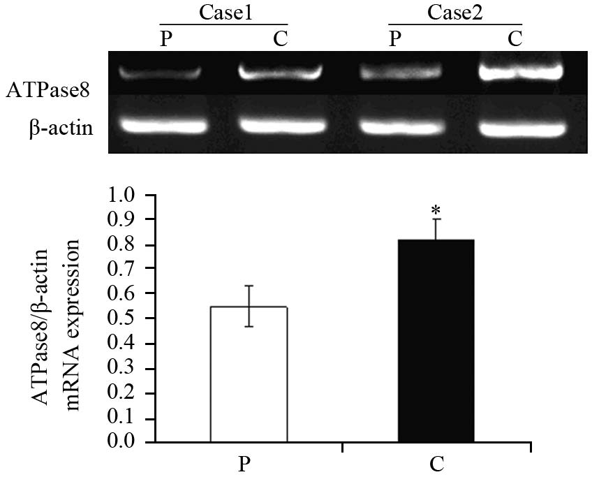 | *: P<0.01, compared with P 图 2 乳腺浸润性导管癌组织与癌旁组织mtDNA ATPase8 mRNA的表达 (n=25) Figure 2 Comparison of mtDNA ATPase8 mRNA expression between breast invasive ductal carcinoma and adjacent normal tissues (n=25) |