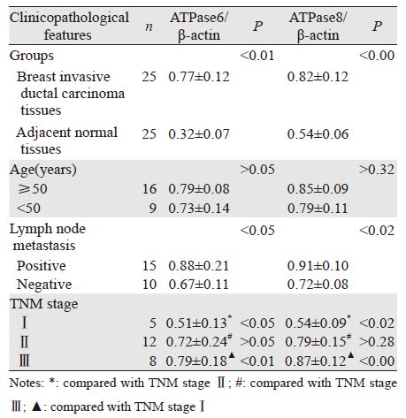 乳腺癌是危害女性健康的常见恶性肿瘤之 一,而浸润性导管癌则是乳腺癌最常见的病理类 型。线粒体DNA(mitochondrial,mtDNA)作为 唯一存在于细胞核外的遗传物质,已被发现与多 种肿瘤的发生、发展有关[1]。mtDNA ATPase6与 ATPase8是编码呼吸链复合体Ⅴ亚基的基因,即共 同编码ATP合酶(ATP syntherase)的F0部分[2]。由 于F0对ATP的产生有导向作用,因此研究ATPase6 与ATPase8在乳腺浸润性导管癌组织中的转录水 平,对于了解乳腺癌的发生、发展以及肿瘤细胞 的能量供应方式具有重要的理论意义。本研究采 用RT-PCR法检测25例乳腺浸润性导管癌组织及相 应癌旁组织的mtDNA ATPase6与ATPase8 mRNA, 并结合相关临床病理参数进行分析,旨在探讨 mtDNA ATPase6与ATPase8的变化在浸润性乳腺导 管癌发生、发展中的作用。