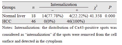 正常肝脏组织中阳性表达的Cx43呈线状分 布于细胞膜上,偶见细胞质表达,见图 1A~1B; 而在HCC组织中,阳性染色颗粒主要分布于细 胞质内,偶见同时有部分细胞膜着色,即发生了 “内化”( internalization)现象,见图 1C~1D。内化率在正常肝脏组织及HCC组分别为22.22%和 100%,两组比较差异有统计学意义(χ2=41.358, P=0.000),见表 2。