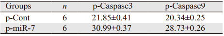 前面的实验结果显示,miR-7过表达可增加凋亡相关分子磷酸化Caspase3和磷酸化Caspase9的水平。为了进一步明确过表达miR-7体内对肿瘤凋亡的作用,我们利用免疫组织化学法检测了各组中相关分子的表达。p-miR-7组与p-Cont组相比,凋亡相关的磷酸化Caspase3和磷酸化Caspase9蛋白水平则显著增加,见图 5。这提示,过表达miR-7可促进肿瘤凋亡相关蛋白的表达。