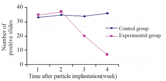 两组植入粒子后,实验组与对照组比较,第1、2周比较差异无统计学意义(P>0.05),可以认为两组VEGF蛋白表达无差别,说明空白粒子对VEGF表达几乎没有影响。而从第3周开始出现差别,第4周差别更明显(P<0.05)。组内比较,实验组组内从第2、3周开始出现差别,第3、4周差别更明显,说明125I粒子对VEGF表达影响于粒子植入第3周比较明显。而对照组组内比较各周未见明显差别,见图 1。