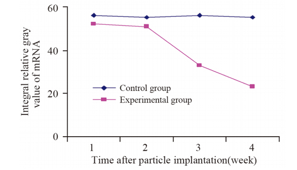 (1) VEGF mRNA表达测定数据及检验:原始数据经正态性检验,差异无统计学意义(Z=0.912,P>0.05),说明数据符合正态分布。进行随机区组设计计量资料方差分析,差异有统计学意义(F=122.780,P<0.05),说明各组裸鼠瘤体内VEGF mRNA的表达总体上不同或不全相同;再进行两两比较q检验(S-N-K法)得知:对照组VEGF mRNA的相对积分灰度值位于同一栏中,两组之间差异无统计学意义(P>0.05),说明空白粒子对VEGF mRNA的表达没有影响。实验组中在125I粒子植入3周后,VEGF mRNA的表达开始降低,差异有统计学意义(P<0.05);粒子植入4周时VEGF mRNA的表达较植入3周时进一步降低,差异有统计学意义(P<0.05)。(2)实验组与对照组VEGF mRNA表达趋势:对照组各周mRNA表达灰度值差异无统计学意义。实验组mRNA表达灰度值粒子植入3周时,VEGF mRNA的表达开始降低,第4周下降更明显,见图 2,从VEGF mRNA电泳图也可看出同样的变化,见图 3。