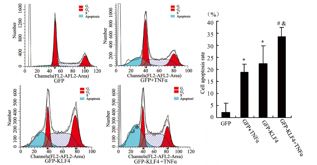 | *: P<0.05,compared with GFP group; #: P<0.05,compared with GFP+TNFα group; &: P<0.05,compared with GFP-KLF4 group 图 4 KLF4促进TNFα介导的SK-BR-3乳腺癌细胞凋亡 Figure 4 KLF4 promoted TNFα-induced apoptosis of breast cancer cells SK-BR-3 |