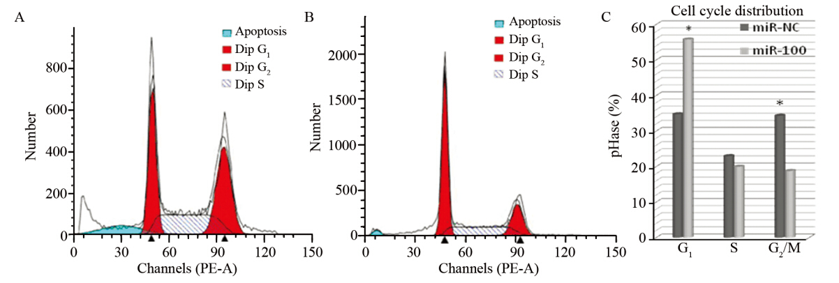 采用配对样本t检验双尾检测,取α=0.05水准,进行H0与H1的假设统计学分析,利用SPSS统计软件,P<0.05为差异有统计学意义。2 结果2.1 miR-100对食管鳞癌细胞株Ec-109细胞周期的影响