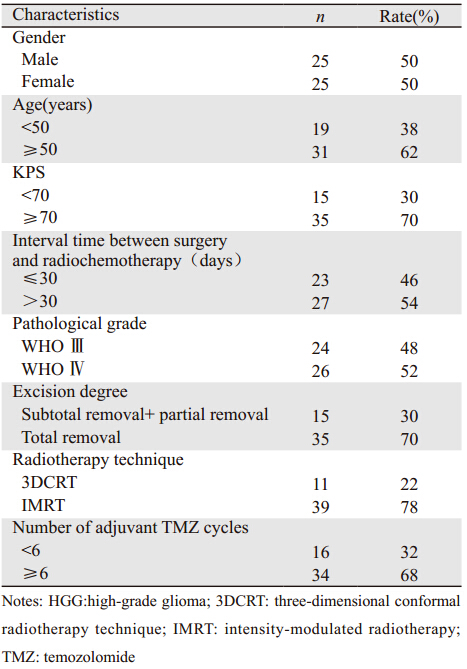 高级别胶质瘤(high-grade glioma,HGG)包括WHO分级Ⅲ级的间变性少突胶质瘤(anaplastic oligodendrogliomas,AO)、间变性少突星形细胞瘤(anaplastic oligoastrocytomas,AOA)、间变性星形细胞瘤(anaplastic astrocytomas,AA)和Ⅳ级的多形性胶质母细胞瘤(g lio b las to ma multiforme,GBM),其中以AA和GBM最为常见,占HGG的80%以上[1]。HGG具有高侵袭性的生物学行为,单纯手术后复发率较高。术后放化疗的应用可明显改善生存,但成人GBM和AA的1年及5年生存率仅分别为35.7%和60.1%及4.7%和25.9%[2]。近年来多个临床试验证实采用替莫唑胺(temozolomide,TMZ)同步联合放疗,后续6周期TMZ辅助化疗的治疗模式可明显改善HGG患者的生存[3,4,5,6,7,8,9,10]。本研究回顾性分析深圳市人民医院肿瘤放疗科采用TMZ联合放疗治疗50例初诊HGG患者的临床资料,观察其疗效及安全性,并分析影响患者预后的因素。1 资料与方法1.1 一般临床资料