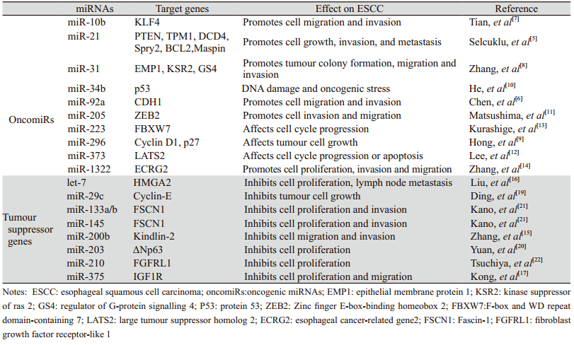 miRNAs在肿瘤中的作用是近年来研究的一个热点,miRNAs表达谱与肿瘤的发病、分类、进展、预后等密切相关。目前,许多基因已被确定与肿瘤相关,miRNAs根据其功能分为致癌miRNAs和抑癌miRNAs。在正常细胞中,抑癌miRNAs高度表达使致癌蛋白表达下调。而在肿瘤细胞中,抑癌miRNAs沉默导致致癌蛋白表达上调,与此同时,致癌miRNAs在肿瘤细胞中的表达使抑癌蛋白的表达下调。超过一半的miRNAs基因位于与肿瘤发生相关的区域或脆性位点。在肿瘤中过度表达的miRNAs,如miR-21、miR-17~92家族,作为致癌基因通过下调抑癌基因促进肿瘤进展,同时抑癌基因let-7、miR-34家族表达下降[1]。致癌miRNAs和抑癌miRNAs都参与细胞分化、增殖、凋亡和代谢等,有望成为肿瘤起源和类型识别的高度组织特异性标志物,具有潜在的临床应用价值。 2 食管鳞癌中的miRNAs及其靶基因 2.1 miRNAs在ESCC中的表达