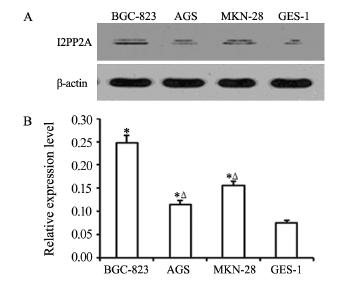 | A: Western blot; B: Quantitative analysis; *: P<0.05,compared with GES-1 cells; Δ: P<0.05,compared with BGC-823 cells 图 1 正常胃黏膜上皮细胞和胃癌细胞中I2PP2A蛋白的表达 Figure 1 Expression of I2PP2A protein in normal gastric mucosal epithelial cells and gastric carcinoma cells |