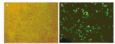 | A: normal view; B: fluorescence view 图 2 重组质粒转染BGC-823细胞后绿色荧光蛋白的表达 Figure 2 The expression of green fluorescent protein (GFP) in BGC-823 cells transfected with recombinant plasmids |