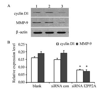 | A: Western blot; B: Quantitative analysis; 1: blank; 2: siRNA con; 3: siRNA I2PP2A; *: P<0.01,compared with blank and siRNA con groups 图 6 I2PP2A表达下调对BGC-823胃癌细胞中cyclin D1和MMP-9蛋白表达的影响 Figure 6 Effect of down-regulated I2PP2A expression on expression of cyclin D1 and MMP-9 proteins in gastric carcinoma cells BGC-823 |