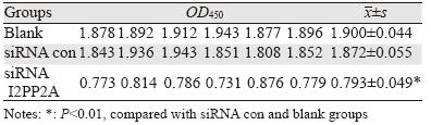 siRNA con与blank两组间比较差异无统计学意 义(P=0.288),而siRNA I2PP2A与siRNA con、 blank组相比差异均有统计学意义(P=0.000; P=0.000),提示下调I2PP2A基因对BGC-823细胞 增殖具有明显抑制作用。应用上述公式计算细胞生 长抑制率,siRNA I2PP2A组约为57.6%,见表 1。