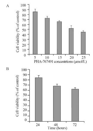 | A:Concentration gradient of PHA-767491;B:Time gradient of PHA-767491 图 1 PHA-767491抑制K562细胞增殖 Figure 1 Proliferation of K562 cells inhibited by PHA-767491 |
