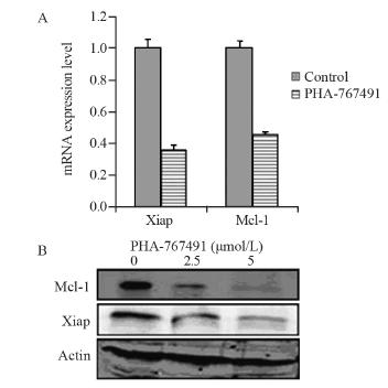 | Xiap: X-linked inhibitor of apoptosis protein; Mcl-1: myeloid cell leukemia-1;A:Xiap and Mcl-1 mRNA levels down-regulated by PHA-767491;B:Protein expression levels of Xiap and Mcl-1 downregulated by PHA-767491 图 2 PHA-767491下调Xiap和Mcl-1的表达 Figure 2 Expression of Xiap and Mcl-1 down-regulated by PHA-767491 |