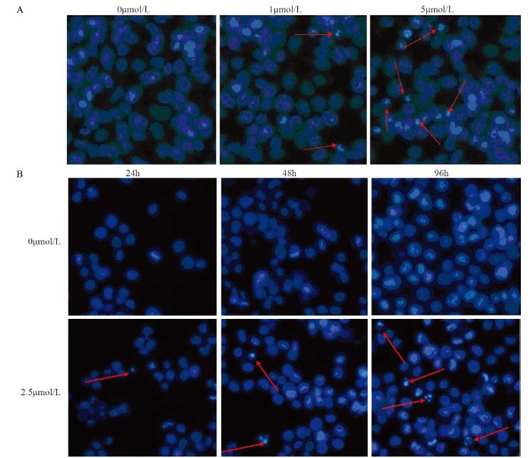 PHA-767491诱导K562细胞凋亡实验结果见 图 3。图 3A为不同浓度PHA-767491作用48 h后, 诱导K562细胞凋亡程度的比较。作为荧光探针 的Hoechst 33342可与DNA分子结合,可见细胞凋 亡过程中细胞核发生片段化,且随浓度的增加, 发生凋亡细胞的数量显著增加,见图 3A箭头所 指。图 3B为浓度为2.5 μmol/L的PHA-767491作用 于K562细胞的不同时间,细胞发生凋亡程度与 空白对照的比较。Hoechst染色结果表明,随着 PHA-767491作用时间的增加,出现核小体凋亡的 K562细胞显著增多,见图 3B箭头所指。