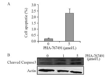 | A:The apoptosis levels of K562 cells were detected by flow cytometry; B: The effect of PHA-767491 on the expression of Caspase3 图 4 流式细胞仪检测PHA-767491诱导K562细胞凋亡 Figure 4 PHA-767491 induced the apoptosis of K562 cells detected by FCM |