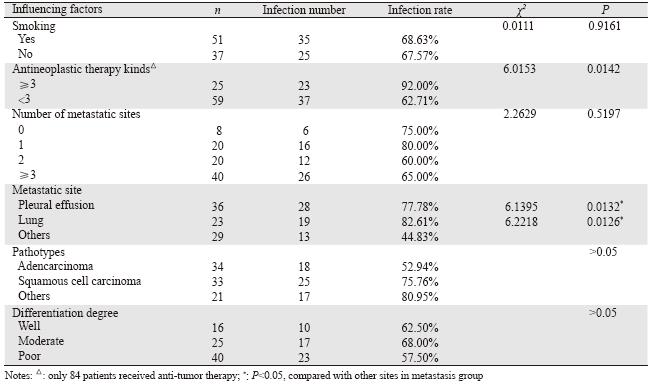 60例患者直接或间接死于肺部感染,占68.18% (60/88),其中12例合并败血症,4例合并大咯血 (以1次咯血量超过100 ml,或24 h内咯血量超过 600 ml以上定义为大咯血),2例合并肺栓塞,4例 诱发急性心肌梗死,5例诱发急性左心衰,5例合并 消化道出血,2例合并尿路感染。22例死于广泛转 移导致的多器官功能衰竭及转移灶引起的功能障 碍,占25% (22/88)。其他死亡原因6例,占6.82% (6/88),其中单纯大咯血致死4例,2例死于室颤。 2.2 肺部感染相关因素分析 2.2.1 病原菌分布