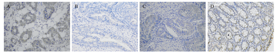 | A: KLF17 high expression in colon cancer; B: KLF17 low expression in colon cancer; C: KLF17 low expression in rectal cancer; D: KLF17 high expression in noncancerous colon mucosa 图 1 KLF17在结直肠癌组织和非癌正常结直肠黏膜的表达(PV-6000 ×200)Figure 1 Expression of KLF17 in colorectal cancer tissues and normal colorectal mucosa tissues (PV-6000 ×200) |