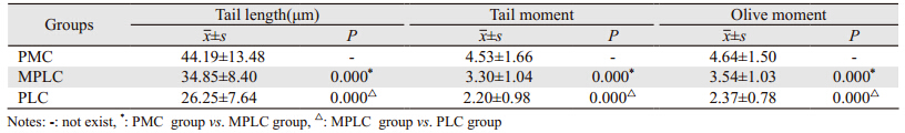 所有数据用SPSS21.0统计学软件进行数据分析,实验数据以百分率和均数±标准差表示,率的比较采用卡方检验,多组间比较采用方差分析,以P<0.05为差异有统计学意义。2 结果 2.1 各组患者外周血单个有核细胞DNA损伤实验结果