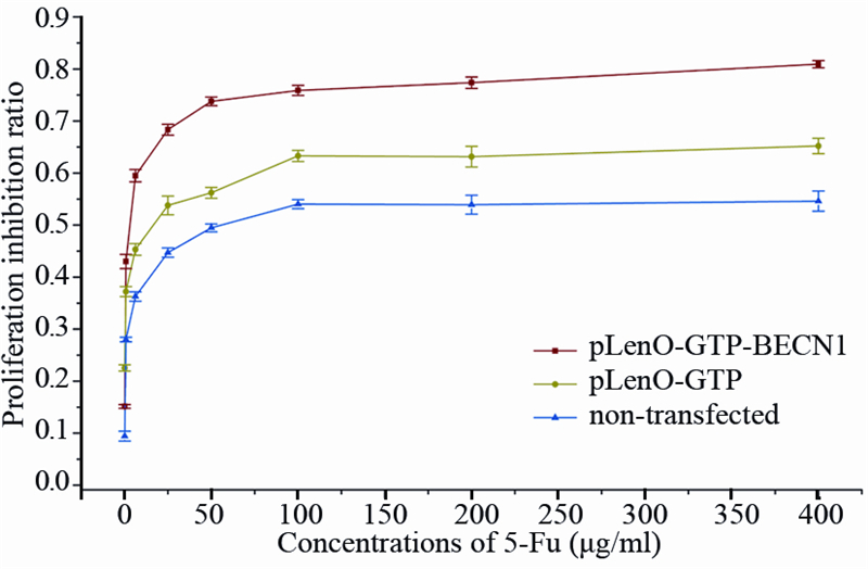 目前,除了化疗药物联合、研制衍生物等传统的提高化疗敏感度的方法外,基因治疗正逐渐成为增强5-Fu化疗敏感度的新方法而走入人们的视线。Beclin 1蛋白除了在自噬中的作用,还可抑制细胞增殖、诱导肿瘤细胞凋亡、停滞细胞周期及炎症扩散和预防细胞基因组突变等[10]。本课题组前期研究发现,Beclin 1具有提高BT-549细胞自噬水平、抑制细胞增殖和阻滞细胞周期等作用[11]。而国内外对于Beclin 1和TNBC的化疗敏感度关系的研究目前仍甚少。