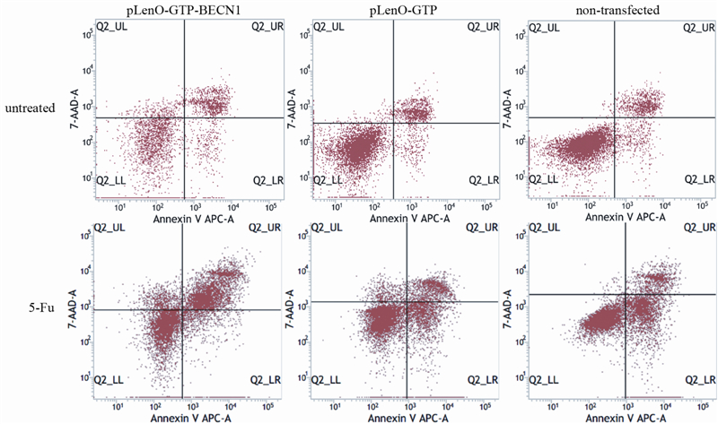 1.6 Annexin V/7-ADD法检测5-Fu处理前后BT-549细胞的凋亡率取对数生长期细胞,按2×106个细胞每孔接种于6孔板,待细胞融合度达到80%左右时,加入50 μg/ml的5-Fu作用48 h,收集全部细胞,冷PBS洗2遍,binding buffer重悬细胞。取100 μl细胞悬液,加入5 μl Annexin V-APC,室温下避光孵育15 min;再加入10 μl 7-AAD,冰上避光孵育10 min,200 μl binding buffer洗1遍,立即用流式细胞仪检测。实验重复3次。