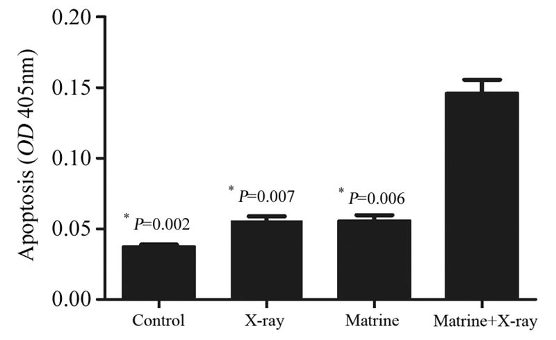 | *: compared with Matrine+X-ray group 图 2 苦参碱和X线联合治疗24h时对HepG2细胞凋亡的影响 Figure 2 The effect of matrine combined with X-ray on apoptosis of HepG2 cells |