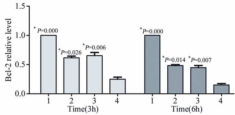 | 1: Control; 2: Matrine; 3: X-ray; 4: Matrine+X-ray; *: compared with Matrine+X-ray group 图 3 苦参碱和X线联合治疗3,6h后Bcl-2表达的变化 Figure 3 The change of Bcl-2 expression after combination treatment of matrine and X-ray for 3,6h |
