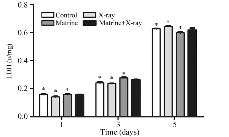| *: compared with Matrinet+x-ray group 图 6 苦参碱和X线联合治疗对LDH表达的影响 Figure 6 The effect of matrine combined with X-ray on LDH expression |