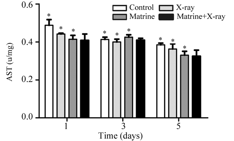 | *: compared with Matrinet+x-ray group 图 7 苦参碱和X线联合治疗对AST表达的影响 Figure 7 The effect of matrine combined with X-ray on AST expression |