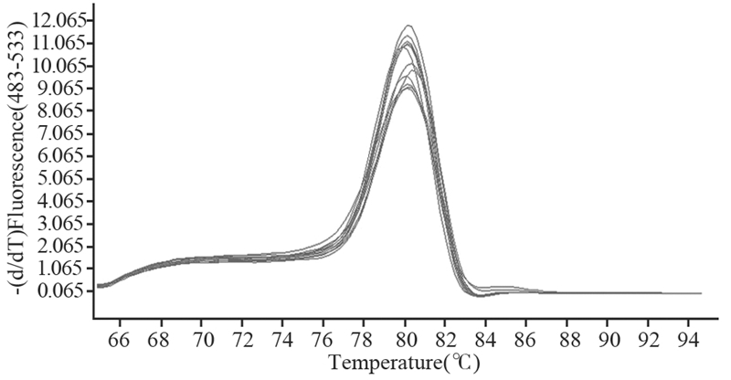 2 结果 2.1 miR-133b在7种胃癌细胞株及正常胃黏膜细胞株中的表达 2.1.1 miR-133b在胃癌细胞中的表达通过miR-133b U6 SnRNA的熔解曲线可见real-time PCR产物的特异性较好,曲线为单峰,表明无引物二聚体扩增和非特异扩增,见图 1; 扩增曲线可见各样品的重复性好,各样品的扩增效率较一致,见图 2。