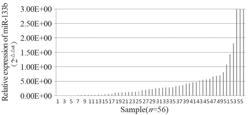 | explainnoteps 图 3 miR-133b在胃癌组织较相应癌旁组织的表达倍数(2-ΔΔCt) Figure 3 The expression of miR-133b compared between gastric cancer tissues and matched adjacent non-tumor tissues(2-ΔΔCt) |