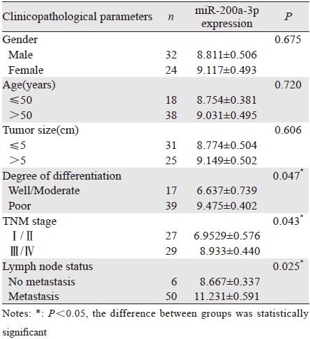 对56例胃癌组织标本中miR-133b的表达水平与患者临床病理参数之间相关性进行统计分析发现,胃癌组织miR-133b表达与分化程度、TNM分期及有无淋巴结转移有关。与性别、年龄及肿瘤大小无关,见表 1。