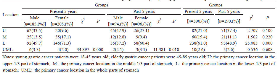 远5年组中,女性青年型胃癌以胃下1/3癌(L)为主(构成比为60.4%),而男性青年型胃癌以胃上1/3癌(U)为主(构成比为47.9%);近5年组中,女性青年型胃癌和男性青年型胃癌均以胃下1/3癌(L)为主(构成比分别为71.3%和49.7%);近5年组与远5年组青年型胃癌发病部位分析,胃下1/3癌(L)构成比有所增加,差异均具有统计学意义,而其他发病部位差异无统计学意义,见表 1。