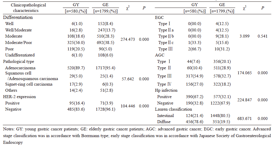 从胃癌分化程度分析,中低分化癌、低分化癌的构成比在青年型胃癌组中明显高于中老年型胃癌组(分别为76.5%和43.5%),差异具有统计学意义(χ2=274.473,P=0.000);鳞癌/腺鳞癌、印戒细胞癌构成比在青年型胃癌组中明显高于中老年型胃癌组(分别为7.9%和1.7%),差异具有统计学意义(χ2=57.642,P=0.000);HER2阳性构成比在青年型胃癌组中明显高于中老年型胃癌组(分别为16.4%和3.9%),差异具有统计学意义(χ2=104.446,P=0.000);早期胃癌各型在青年型胃癌组与中老年型胃癌组中的构成比差异无统计学意义(χ2=3.099,P=0.541);进展期胃癌BorrmannⅢ、Ⅳ型在青年型胃癌组中的构成比为81.9%,在中老年型胃癌组中的构成比为50.9%,两组间差异具有统计学意义(χ2=174.065,P=0.000);幽门螺杆菌阳性构成比在青年型胃癌组为67.2%,在中老年型胃癌组为32.1%,两组间差异具有统计学意义(χ2=224.847,P=0.000);Lauren分型中,青年型胃癌组中以弥漫型为主(构成比为78.6%),中老年型胃癌组中以肠型为主(构成比为80.5%),两组间差异具有统计学意义(χ2=683.671,P=0.000),见表 2。