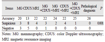 钼靶诊断正确率为77%(20/26),彩超为50%(13/26),磁共振增强为85%(22/26),钼靶联合彩超的诊断正确率为85%(22/26),钼靶联合磁共振增强为92%(24/26),彩超联合磁共振增强为85%(22/26),钼靶联合彩超联合磁共振增强为96%(25/26),检查结果采用Kruskal-Wallis检验(χ2=22.281,P=0.001)差异有统计学意义,见表 1。