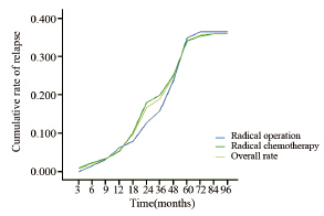 | 图 1 两种根治治疗的总体累积生化复发率变化图 Figure 1 Variation of the overall accumulation biochemical recurrence rate of two radical treatment |