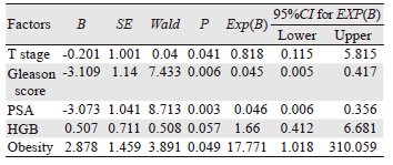 将上述单因素分析显示有统计学意义的变量纳入Logistic回归模型中进行多因素相关回归分析,结果显示:肿瘤分期、Gleason评分、治疗前PSA水平、肥胖是前列腺癌患者生化复发的独立危险因素,见表 2。