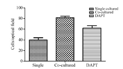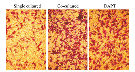 2 结果 2.1 各组U87细胞生长情况倒置显微镜下观察各组细胞在培养24 h后的生长情况,结果可见共培养组U87细胞数目较多,增殖活力强,较聚集,细胞形态多样,多呈长梭形生长,胞质丰富,伪足长,细胞之间相互粘连完好呈网格状,且有向Transwell小室下聚集趋势,生长成中间密集,周围较稀疏。而DAPT处理组细胞数量较共培养组明显较少,但仍高于单纯组U87细胞。单纯组细胞生长形态为正常U87细胞,大多数细胞呈长梭形,数量中等,较稀疏。