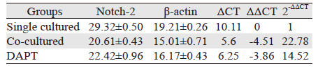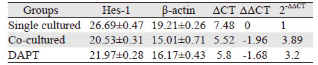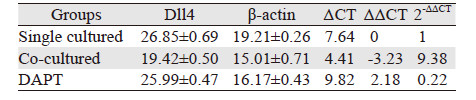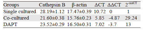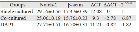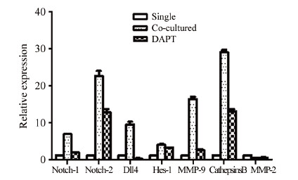 | The expression of β-actin was also detected as controls.The expression of Cathepsins B,MMP-9,Notch-1,Notch-2,Hes-1,Dll4 were upregulated when co-cultured with HUVEC (P < 0.05),but they were a little bit down-regulated when treated with DAPT (P < 0.05) 图 3 共培养24h后U87细胞各基因mRNA的Real-time PCR统计结果 Figure 3 Relative expression of mRNA in U87 cells in each group detected by Real-time fluorescence quantitative-PCR after 24h |