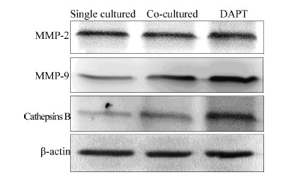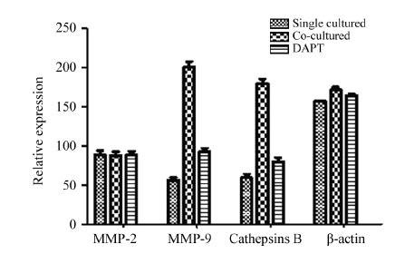 当血管内皮细胞与胶质瘤共培养48 h后,U87细胞Cathepsins B (F =3180.93,P =0.00)、MMP-9(F =1170.56,P =0.00)蛋白表达较单独培养组均明显上升,而DAPT处理组U87细胞Cathepsins B (F =1765.41,P =0.00)、MMP-9(F =546.45,P =0.00)蛋白表达较单独培养组也有明显上调,但较正常培养组增幅低,MMP-2的表达在单纯组和共培养组(F =4.679,P =0.097)、共培养组和DAPT处理组之间(F =2.16,P =0.216)都无明显变化,见图 4、5。