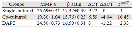 Real-time PCR结果显示,当血管内皮细胞与胶质瘤共培养24 h后,U87细胞Cathepsins B、MMP-9、Notch-1、Notch-2、Hes-1、Dll4 mRNA的表达较单独培养组均明显上升,而DAPT处理组U87细胞Cathepsins B、MMP-9、Notch-1、Notch-2、Hes-1 mRNA的表达较单独培养组也有明显上调,但较共培养组增幅低(F CB=160.58,P =0.00;F MMP-9=127.55,P =0.00;F Notch-1=62.67,P =0.00;F Notch-2=143.47,P =0.00;F Hes-1=43.22,P =0.00)。然而,各组细胞MMP-2mRNA表达无明显变化趋势,差异无统计学意义(F MMP-2=5.49,P =0.06),见表 1~7、图 3。