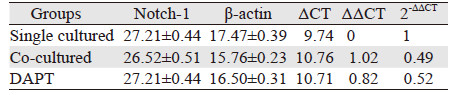 1.2.4 Real-time PCR检测Notch1、Notch2、Hes1、Dll4、Cathepsins B、MMP-9、MMP-2 mRNA的表达水平按照1.2.2中Transwell共培养系统培养细胞24 h后,取六孔板下室U87细胞用TRIzol总RNA提取试剂提取各组U87细胞总RNA,RNA按反转录试剂盒合成cDNA,反转录条件:37℃反应15 min,85℃反应5 s。以SYBR Green荧光染料掺入法进行扩增,扩增反应条件为95℃ 30 s;95℃ 5 s、60℃ 30 s,40次循环,结果判定采用2-ΔΔ法:ΔCT=CT目的基因-CT内参,ΔΔCT=ΔCT处理组-ΔCT对照组,处理组的相对表达值=2-ΔΔCT。对照组的相对表达值=l。实验结果以β-actin为内参照,计算各目的mRNA的相对表达水平,各基因引物序列:Notch1:正向引物:5'-AGCTACTCCTCGCCTGTGGACAA-3',反向引物:5'-ACATTAGAGTGCGGCGACGAGGA-3';Notch2:正向引物:5'-AAAAATGGGGCC AACCGAGAC-3';反向引物:5'-TTCATCCAGAAGGCGCACAA-3';Hes1:正向引物:5'-TAGCTCGCGGCAT T C CAAGC TG 3',反向引物:5'-AAGCGGGTCACCTCGTTCATGC 3';Dll4:正向引物:5'-ATCAACGAGCGCGGCGTACT 3',反向引物:5'-TTGGTGCCCAATACCCCCCT 3';Cathepsins B:正向引物:5'-CTGCAGCGCTGGGTGGATCTAGGAT-3',反向引物:5'-ACGTTGTAGAAGTTGTGCCCGGC-3';MMP-9:正向引物:5'-TGTGCTCTTCCCTGGAGACCTGA-3',反向引物:5'-ATGGCCTTCAGCGTGGCGCTAT-3';MPP-2:正向引物:5'-AGATCTTCTTCTTCAAGGACCGGTT 3',反向引物:5'-GGCTGGTCAGTGGCTTGGGGTA 3';内参β-actin:正向引物:5'-ACGGGGTCACCCACACTGTGC-3',反向引物:5'-CTAGAAGCATTTGCGGTGGACGATG-3'。