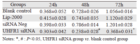 肝癌的发病机制涉及到多个肿瘤相关基因的异常表达及其参与的多个信号通路的异常[9]。UHFR1是近年来新发现的一个癌基因,其异常表达与多种肿瘤的进展密切相关。我们研究发现,肝癌组织中UHFR1的表达明显上调,并且高表达的UHFR1可能参与了肝癌的发生发展。为进一步验证UHFR1表达下调是否抑制肝癌的进展,我们进行了一系列细胞功能实验。