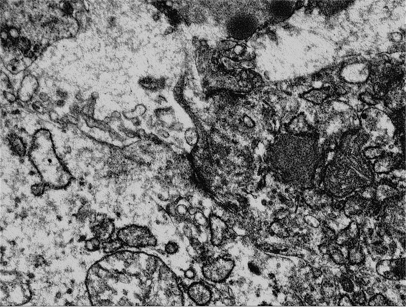 | 图 2 高-中分化腺癌中间隙连接破坏不完整 (透射电子显微镜×100 000) Figure 2 Incomplete gap junctions in well-moderately differentiated gastric cancer tissues (TEM×100 000) |