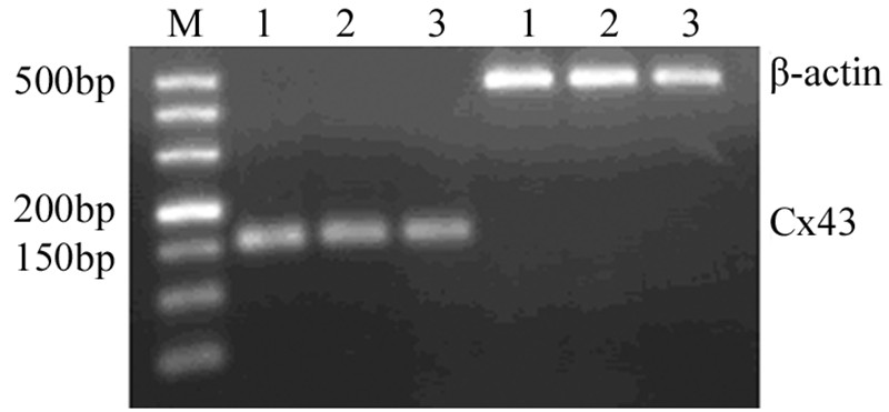 1.3.3 RT-PCR方法采用TRIzol试剂盒分别提取胃癌组织及正常胃组织的总RNA,Cx43的循环条件为94℃预变性5 min,94℃变性30 s,58℃复性30 s,72℃延伸1 min,35个循环;72℃延伸5 min,β-actin的循环条件为94℃预变性5 min,94℃变性30 s,55℃复性30 s,72℃延伸1 min,30个循环;72℃延伸5 min。PCR扩增产物2%琼脂糖凝胶电泳进行定性检测,相应位点出现单一电泳条带为阳性表达,以β-actin做内参照,电泳结果用凝胶图像分析系统进行吸光度测定。